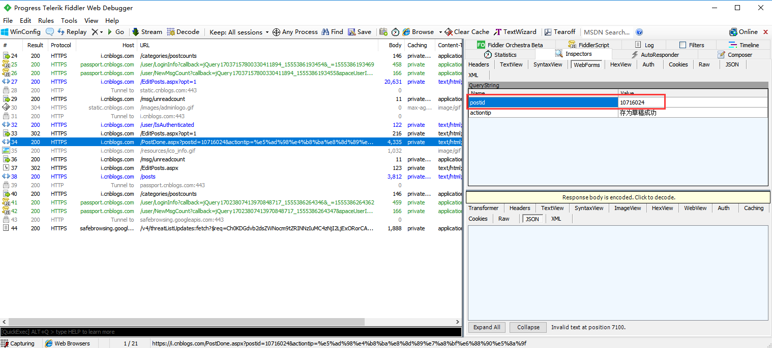 2、用fiddler抓包,抓到删除新建随笔的请求,从抓包结果可以看出,传的json参数是postId