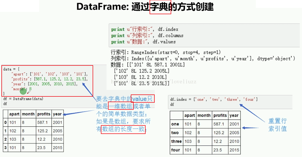 #2.DataFrame通过字典创建,键作为列索引,键值作为数据值,行索引值自动生成