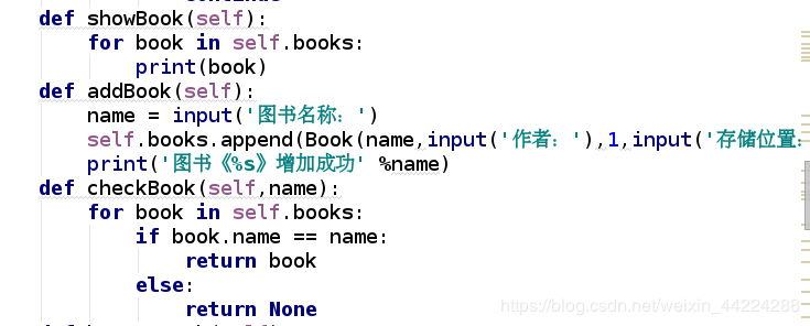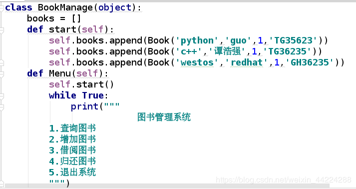 self.books.append(Book('java', 'westos', 1, 'PKA7844'))