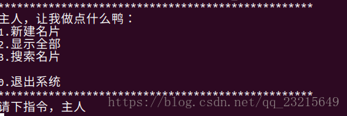 2.可以通过输入命令来选择新建名片、显示所有名片、搜索名片。当搜索到名片时,可以对其进行删改。