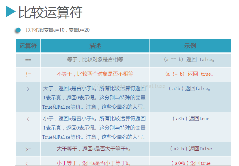 #比较运算符 a = 10 b = 20 print(a==b) #比较两个元素是否相等,返回一个bool类型的值 print(a!=b) #比较两个元素是否不相等 print(a<b) #比较a是否小于b print(a>b) #比较a是否大于b print(a<=b) #比较a是否小于等于b