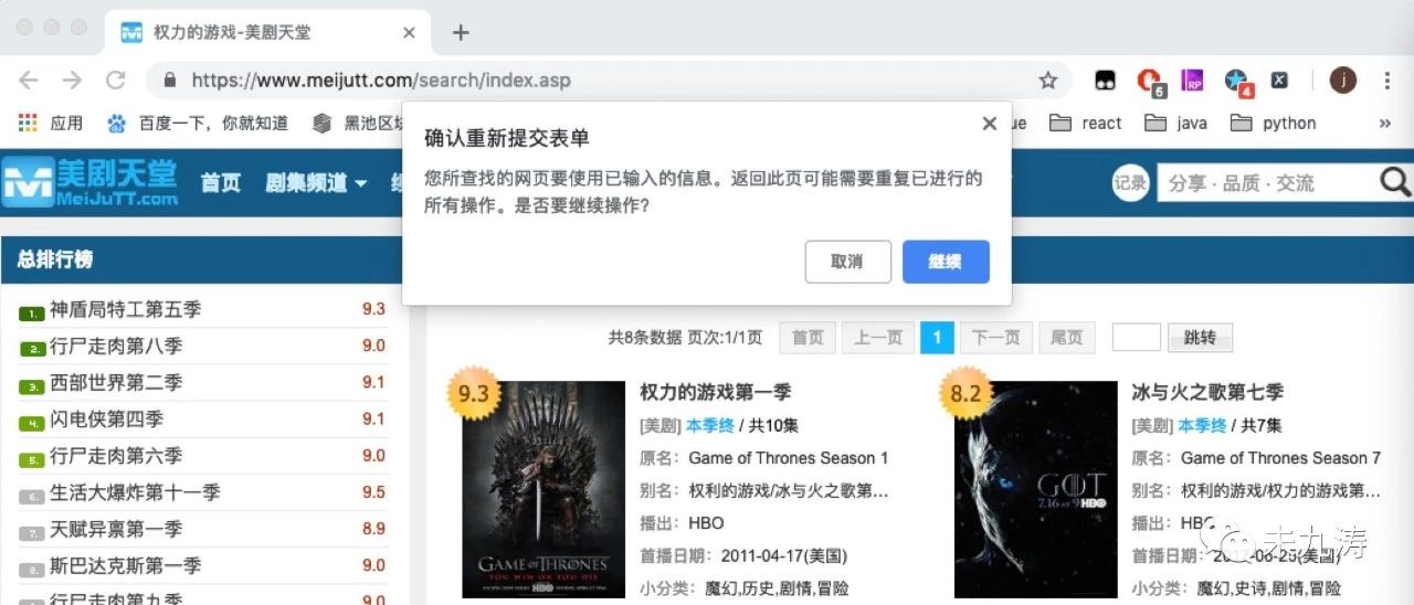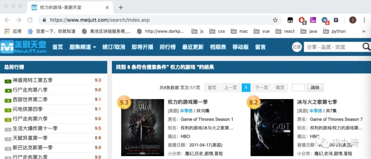 美剧《权力的游戏》终于要开播最后一季了,作为马丁老爷子的忠实粉丝,为了能够看得懂第八季复杂庞大的剧情架构,本人想着将前几季再稳固一下,所以就上美剧天堂下载来看,可是每次都上去下载太麻烦了,于是干脆自己写个爬虫爬下来得了。