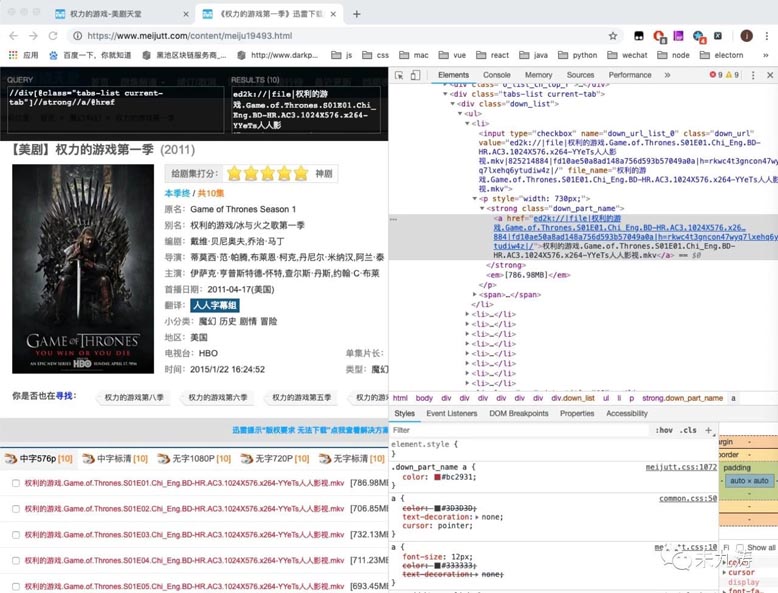 我们根据获取到的链接,再次通过 urllib 库进行页面访问,即我们手动点击进入其中的一个页面,比如 权利的游戏第一季,再次通过 xpath 获取到我们所需要的下载链接: