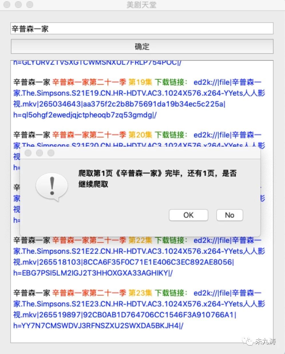 如果搜索内容存在,在搜索完成第一页后提示一下是否需要继续爬取,点击 No 表示停止爬取,点击 OK 表示继续爬取。