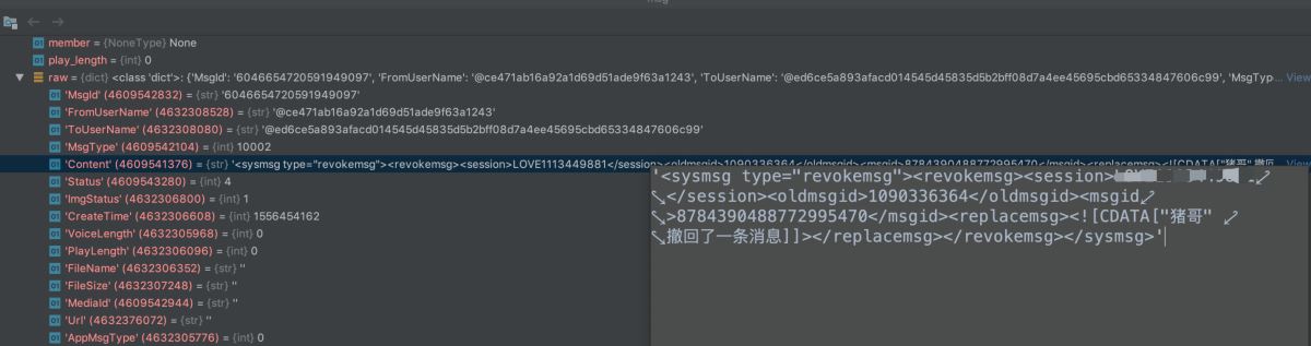 猪哥给大家演示一下正常消息和撤回消息的内容到底有什么区别: