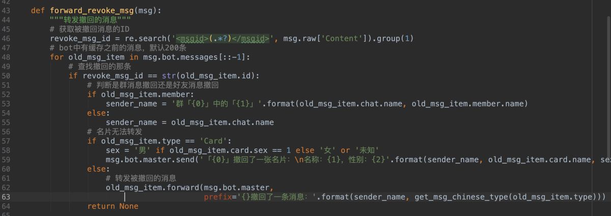根据抓取正常消息和撤回消息的内容我们发现规则:撤回消息中会包含之前被撤回的那条消息的msgid,那我们只要找到之前那条消息就可以了,而wxpy模块默认为我们缓存了最近的200条消息,所以我们只要遍历这些历史消息然后比较msgid就可以找到被撤回的那条消息啦!