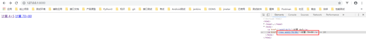 点击第二个a标签跳转请求的url为http://127.0.0.1:8000/add2/70/80/