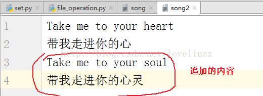 f = open("song2",'a',encoding="utf-8") #a:追加模式。不存在的文件则创建;存在只追加内容