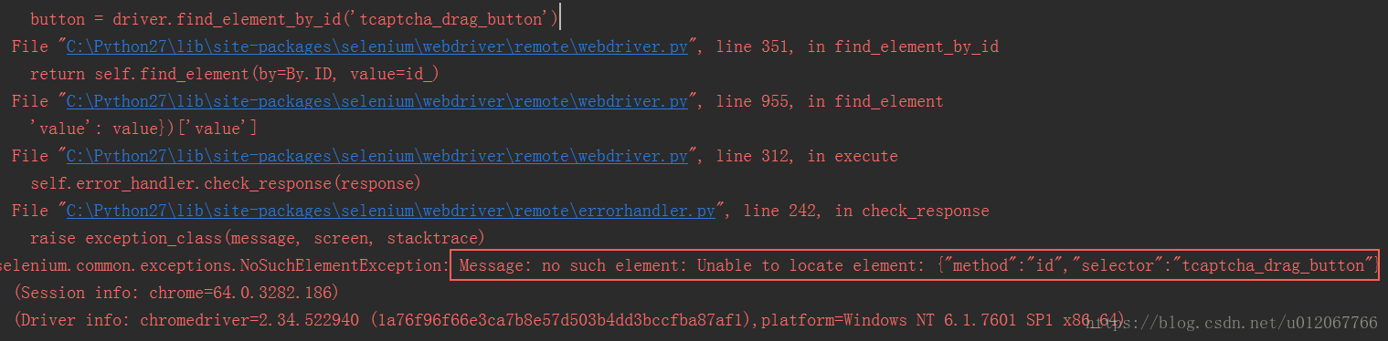 通过上面的截图可以知道,id值为"tcaptcha_drag_button"的div标签代表的就是“蓝色滑块”,所以最开始我是直接尝试去拖动它,但是这时候发现报错了,部分截图如下:
