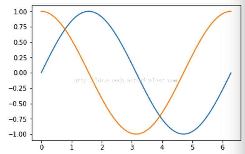 import numpy as np import matplotlib.pyplot as plt X = np.linspace(0, 2 * np.pi, 100) YSinValues = np.sin(X) YCosValues = np.cos(X) plt.plot(X, YSinValues) plt.plot(X, YCosValues) plt.show()