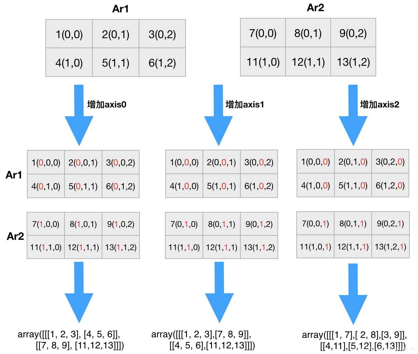 >>> np.stack((ar1, ar2)) # 增加第一个维度(axis0,之后的axis向后顺延:0—>1, 1—>2)