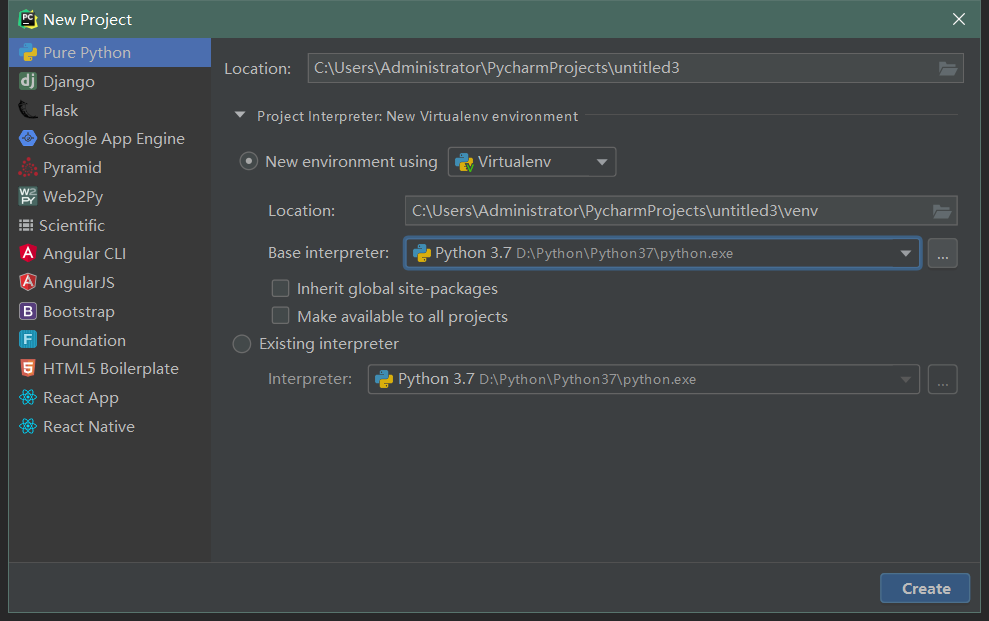 安装好后,新建项目。在Baseinterpreter里面填入的是你Python所在的位置,而Location是你项目代码及其他文件所在的位置。