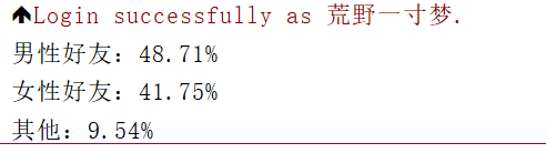 import itchat # 先登录 itchat.login() # 获取好友列表 friends = itchat.get_friends(update=True)[0:] # 初始化计数器,有男有女,当然,有些人是不填的 male = female = other = 0 # 遍历这个列表,列表里第一位是自己,所以从"自己"之后开始计算 # 1表示男性,2女性 for i in friends[1:]: sex = i["Sex"] if sex == 1: male += 1 elif sex == 2: female += 1 else: other += 1 # 总数算上,好计算比例啊~ total = len(friends[1:]) # 好了,打印结果 print (u"男性好友:%.2f%%" % (float(male) / total * 100)) print (u"女性好友:%.2f%%" % (float(female) / total * 100)) print (u"其他:%.2f%%" % (float(other) / total * 100))