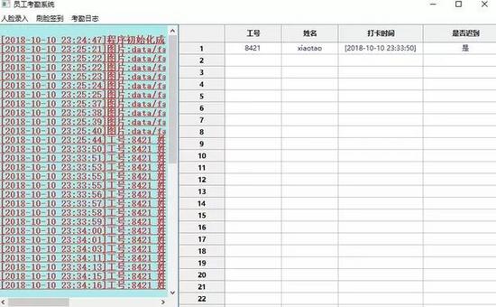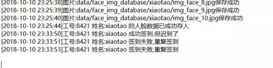 考勤时,须满足三个条件:面部信息已录入、在打卡时间段内、未重复打卡,只有打卡成功,打卡人姓名及工号、打卡日期及时间才会被当成一行记录保存到数据库并在控制台输出打卡成功信息,否则会在控制台输出失败及其原因信息。