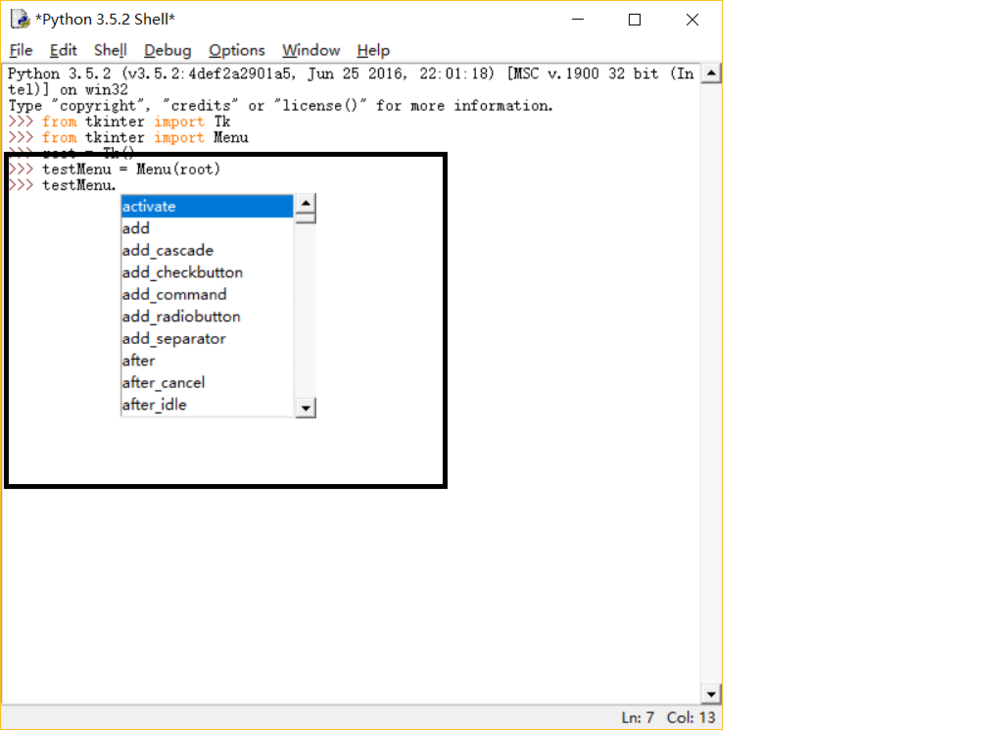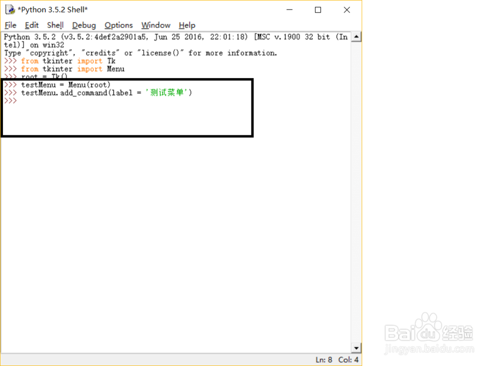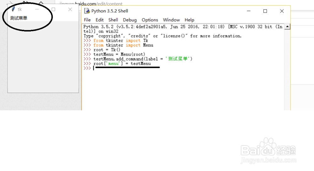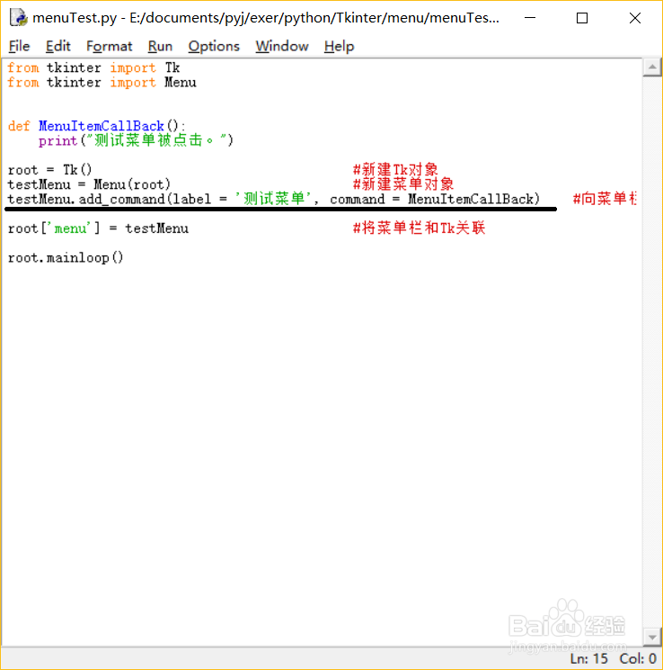 使用root = Tk()新建一个Tk对象并赋值给root,然后再通过testMenu = Menu(root)新建一个菜单对象,并且和root关联。