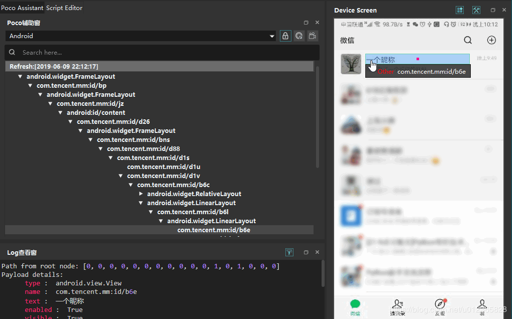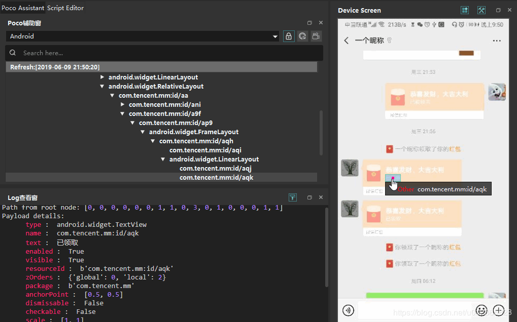 识别微信中的消息,是红包还是普通的信息,这里我们通过聊天消息的元素标识来判断。这里我们借助了「Airtest IDE」工具来实现。