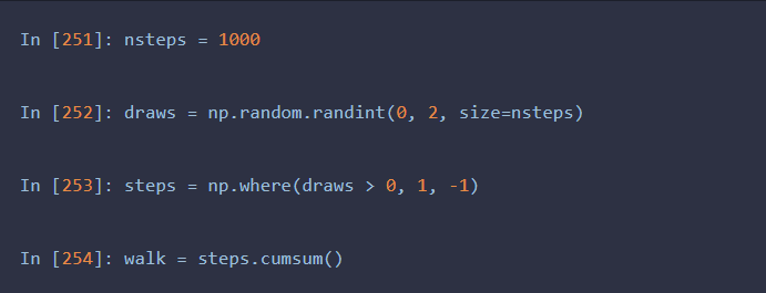 随机漫步中各步的累计和,可以用一个数组运算来实现。因此,我用np.random模块一次性随机产生1000个“掷硬币”结果(即两个数中任选一个),将其分别设置为1或-1,然后计算累计和