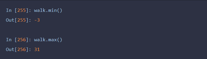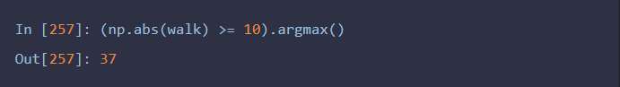 假设我们想要知道本次随机漫步需要多久才能距离初始0点至少10步远(任一方向均可)。np.abs(walk)>=10可以得到一个布尔型数组,它表示的是距离是否达到或超过10,而我们想要知道的是第一个10或-10的索引。可以用argmax来解决这个问题,它返回的是该布尔型数组第一个最大值的索引(True就是最大值)