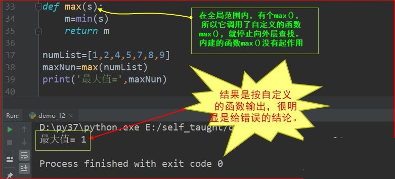 在全局范围内,调用max()函数,因为有个自定义函数和内建的函数max()同名,所以它调用了,自定义的函数max(),就停止向外层查找。