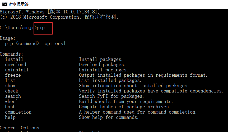 1)在运行pip命令这里,有可能你会遇到如下这样的提示:Did not provide a command
