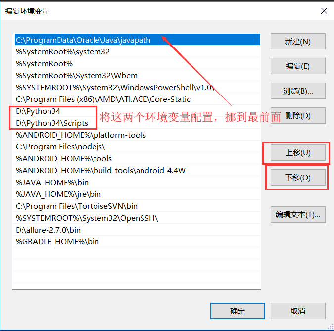 2、在系统的环境变量中,将python的环境变量(上图中第三个),配置到最前面即可。配置步骤如下(图片为win10系统):