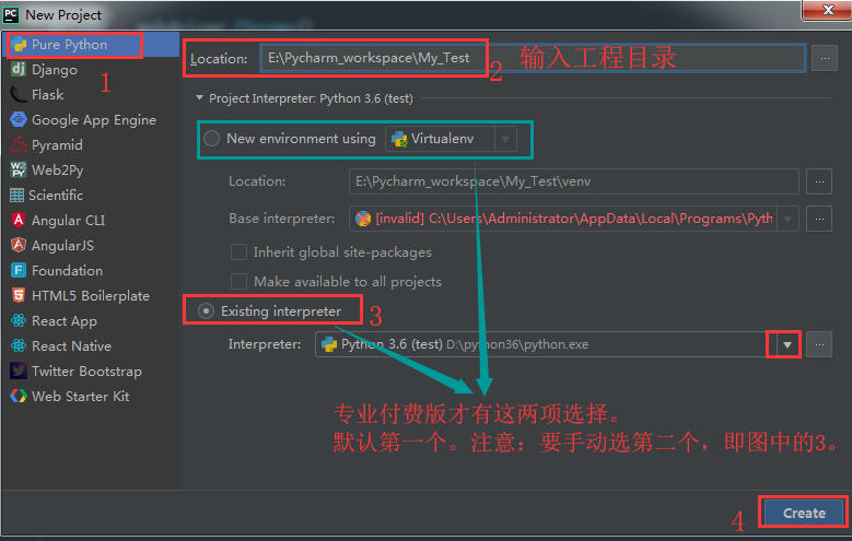 付费专业版:默认会给你创建一个新的虚拟环境(开发python项目好用,初学者可先跳过,不然容易挖坑)。需要手动更改为:系统已安装的python。具体如下图所示的3。