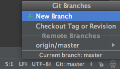 在pycharm的右下角有git的相关分支信息(前提是用了git),可以看到当前只有一个master分支(本地和origin)