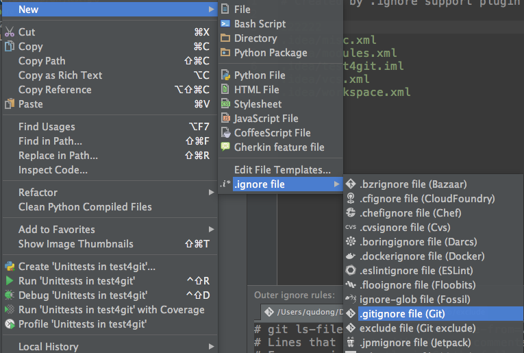 在项目根目录下创建 .gitignore,这个文件也可以通过pycharm创建并支持自动补全功能