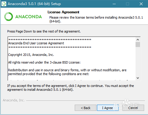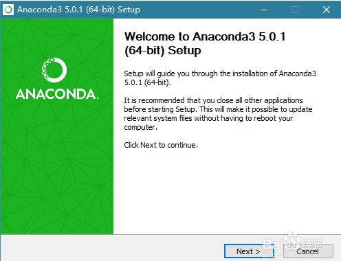双击下载好的Anaconda3-5.0.1-Windows-x86_64.exe 文件,出现如下界面,点击 Next 即可。
