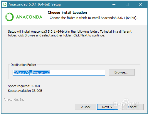 Destination Folder 是“目标文件夹”的意思,可以选择安装到什么地方。默认是安装到 C:\Users\username\Anaconda3 文件夹下(username是你的 Windows 用户名)。你也可以选择 Browse... ,选择想要安装的文件夹。我这里 C 盘空间充裕,所以我直接就装到默认的地方。