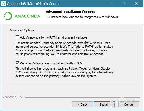 这里来到 Advanced Options 了,所谓的“高级选项”。如果你英文好,有一定背景知识的话,肯定明白这界面上的意思。第一个是加入环境变量,第二个是默认使用 Python 3.6,直接按照默认的,也可自己修改,点击“Install”,终于开始安装额。
