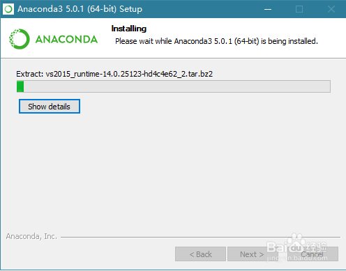 安装时间根据你的电脑配置而异,电脑配置高,硬盘是固态硬盘,速度就更快。安装过程其实就是把Anaconda3-5.0.1-Windows-x86_64.exe 文件里压缩的各种 dll 啊,py 文件啊,全部写到安装目标文件夹里。