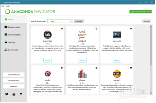 点击 Anaconda Navigator ,第一次启用,会初始化,耐心等待一段时间,加载完成,界面如图。