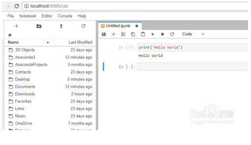 我们点击 jupyterlab 下面的 Launch ,会在默认浏览器(我这里是 Chrome)打开http://localhost:8888/lab 这样一个东东,这里就可以输入 Python 代码啦,来一句 Hello World 吧。
