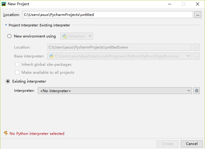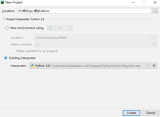 Location是项目存放的位置,第一个单选按钮是使用虚拟环境,后期补上,这里我们使用第二个添加本地python环境