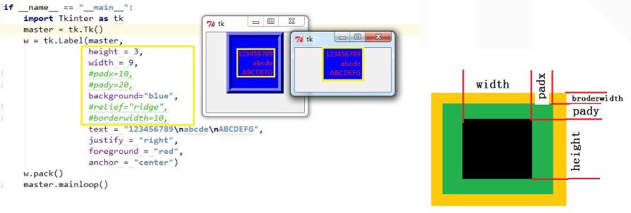 <2>填充区参数:指的是内容区和边框之间的间隔大小,单位是像素。参数有:padx , pady,类型是int。