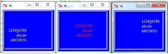 <3>边框参数:样式relief(可选值为:flat(默认),sunken,raised,groove,ridge),borderwidth(边框的宽度,单位是像素,默认根据系统而定,一般是1或2像素)