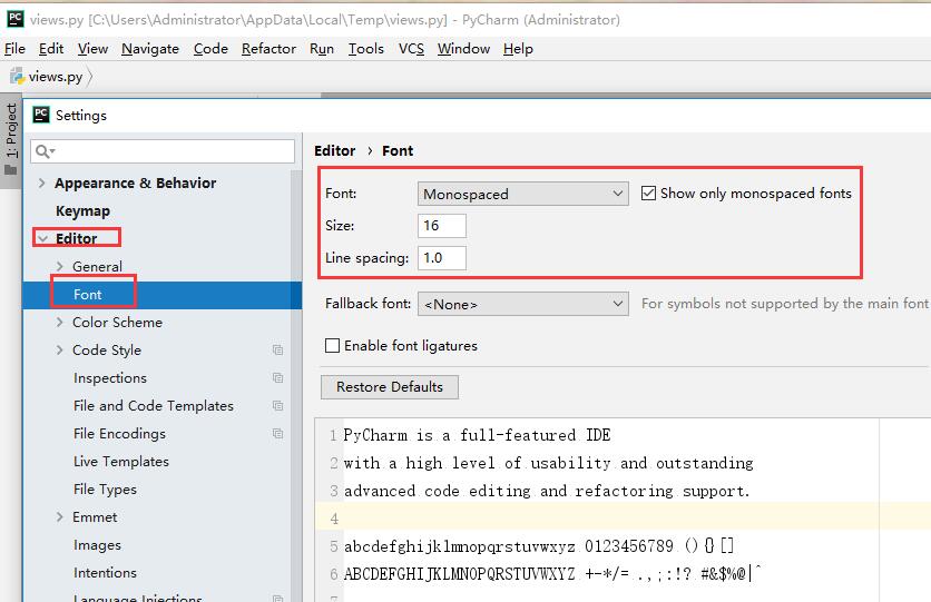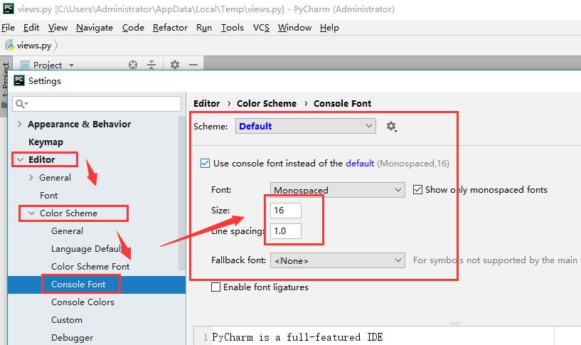 3、调整编辑器字体及其大小及控制台的字体及其大小