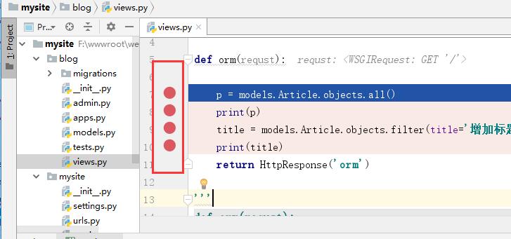 设置断点:在代码前面与行号后面之间的空白处,鼠标单击,就可以设置断点。如下: