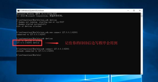 4、打开CMD,进入夜神模拟器的安装路径下:D:\software\nox\Nox\bin,运行指令:nox_adb.exe connect 127.0.0.1:62001和指令adb devices查看设备名,如下图所示