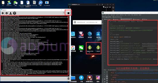 5、运行pycharm代码,并查看结果,如下图所示(暂时不理会出错问题,后续会讲解)但是在模拟器看到新增了两个小机器人,就表示已经成功了:
