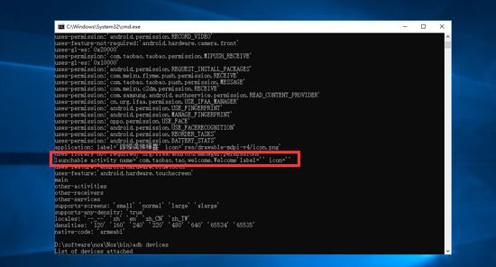 aapt dump badging C:\apps\xxxxx.apk (路径\app包名,也就是安装包在你电脑的位置)