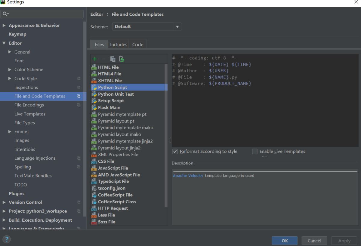 1.打开pycharm,选择File-Settings(Ctrl + Alt + S),再选择Editor--Color&Style--File and Templates--Python-Script