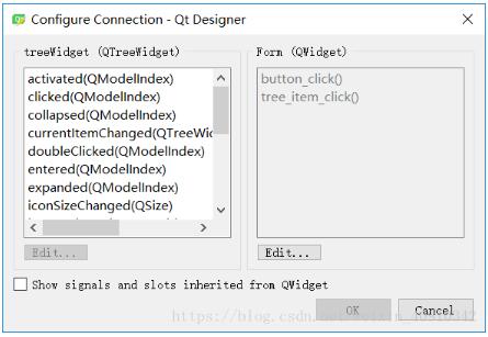 左边是Tree Widget的信号的列表,右边是我们自定义的槽,可以点击Edit进行增加和删除。