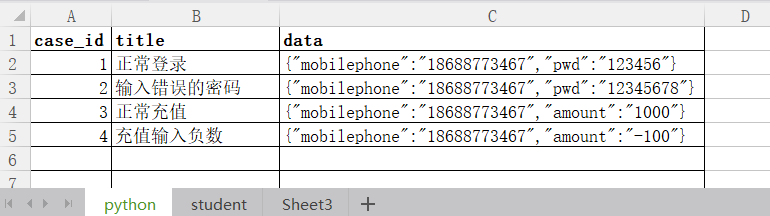 [{'title': '正常登录', 'case_id': 1, 'data': '{"mobilephone":"18688773467","pwd":"123456"}'},