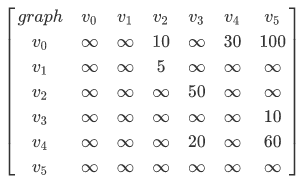 其中,带权值的有向图采用邻接矩阵graph来进行存储,在计算中就是采用n*n的二维数组来进行存储,v0-v5表示数组的索引编号0-5,二维数组的值表示节点之间的权值,若两个节点不能通行,比如,v0->v1不能通行,那么graph[0,1]=+∞ (采用计算机中最大正整数来进行表示)。那如何求解从v0每个v节点的最短路径长度呢?