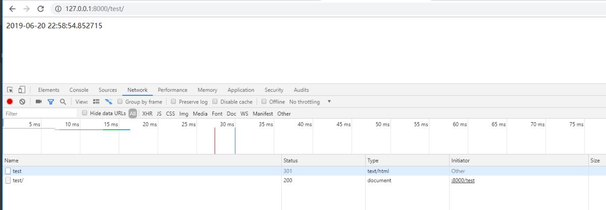目前APPEND_SLASH=True,我们打开浏览器的开发者工具,查看网络请求,输入127.0.0.1:8000/test 这里我是没有加斜线的