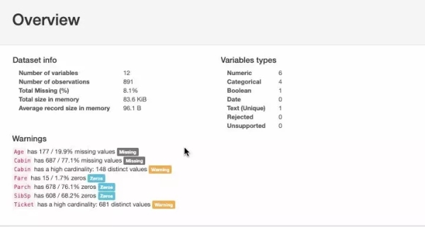 由Pandas Profiling包计算出的统计信息包括直方图、众数、相关系数、分位数、描述统计量、其他信息——类型、单一变量值、缺失值等。