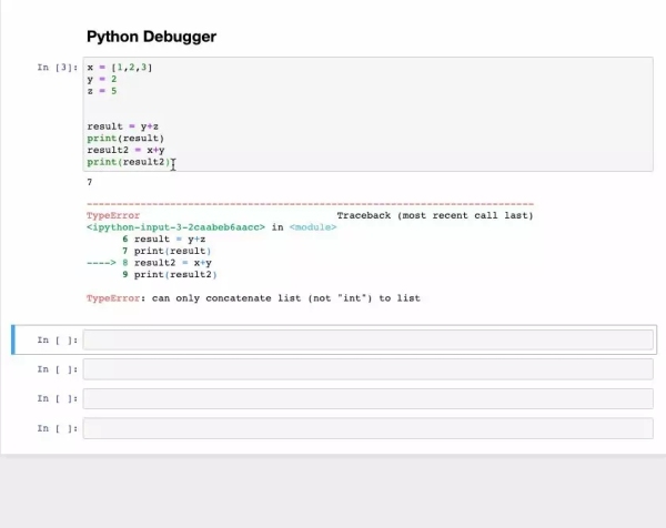 交互式调试器也是一个神奇的功能,我把它单独定义了一类。如果在运行代码单元时出现异常,请在新行中键入%debug并运行它。 这将打开一个交互式调试环境,它能直接定位到发生异常的位置。还可以检查程序中分配的变量值,并在此处执行操作。退出调试器单击q即可。