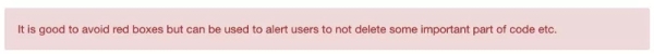 <div class="alert alert-block alert-danger"> It is good to avoid red boxes but can be used to alert users to not delete some important part of code etc. </div>